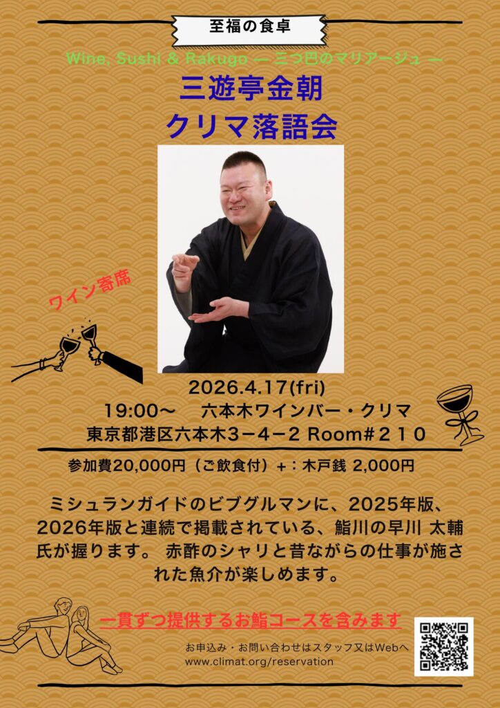プログラム内容としては お鮨と落語、そしてワインのeventとなります🍷 ご参加よろしくお願いいたします。